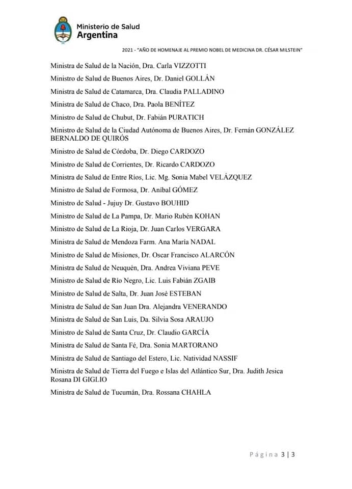 “Las ministras y los ministros de Salud de la nación, de las provincias y de la Ciudad Autónoma de Buenos Aires trabajamos desde el 10 de diciembre de 2019 de manera unida y consensuada, priorizando la salud pública con un enfoque federal. Lo hacemos sin importar nuestras identidades políticas o partidarias, porque nuestra única bandera es la política sanitaria”, reza el pronunciamiento.