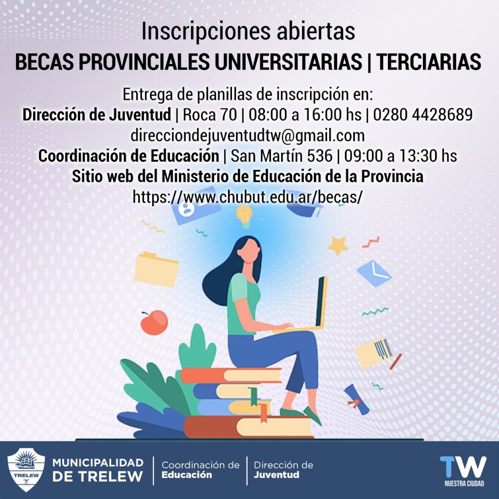 Además, quienes tengan acceso a internet pueden descargar el formulario de inscripción en https://www.chubut.edu.ar/becas/ y presentarlo en la Dirección de Juventud ubicada en Roca N° 70, con atención al público de 8 a 16. O también, en la Coordinación de Educación que se situa en San Martin N° 536, con atención de 9 a 13:30. Ante cualquier duda pueden concurrir a dichos lugares, para ser asesorados.