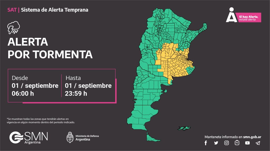 El alerta amarilla está en vigencia hasta mañana a la madrugada y significa posibles fenómenos meteorológicos con capacidad de daño y riesgo de interrupción momentánea de actividades cotidianas, precisó el SMN.