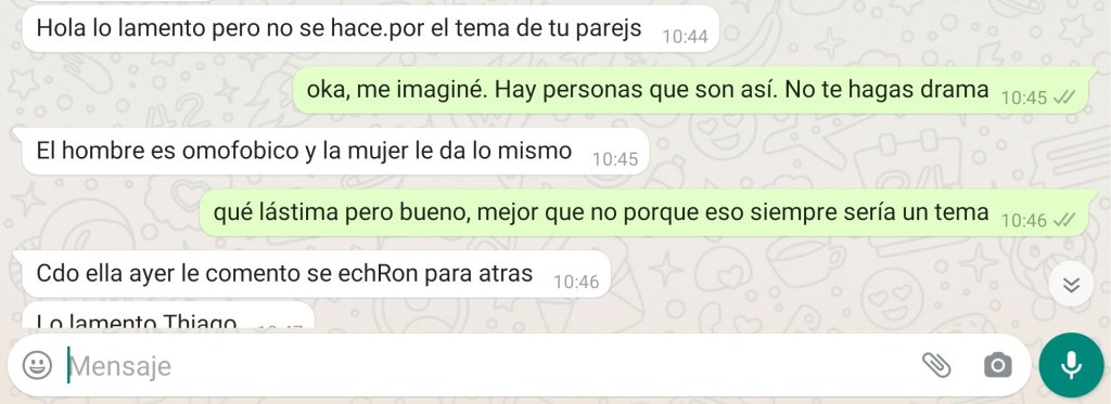 Una vecina que hizo de intermediaria para conseguirles un departamento en alquiler les explicó en un mensaje de WhatsApp que el propietario era «homofóbico» y que a la esposa del hombre, también dueña de la vivienda, «le da lo mismo».