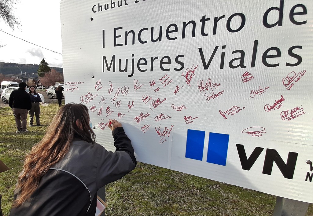 Las capacitaciones brindadas estuvieron divididas en dos formatos. En primer lugar, hubo un espacio dedicado a las mujeres que desarrollan tareas administrativas, donde pudieron actualizar el manejo de los sistemas de procesos, compras y circuitos administrativos. Por otro lado, se desarrolló un espacio de capacitación a las cuadrillas viales municipales femeninas que realizan tareas para Vialidad Nacional, apuntando a la seguridad e higiene, el trabajo de las banderilleras, tareas de señalamiento y elaboración y colocación de señales viales. Precisamente, el cierre del encuentro consistió en la elaboración de un cartel con la referencia al Primer Encuentro de Mujeres viales, que ellas mismas confeccionaron y colocaron en el predio de Esquel de Vialidad Nacional. El cartel fue firmado por todas las participantes, que posteriormente recibieron su certificado por haber participado del histórico encuentro.
