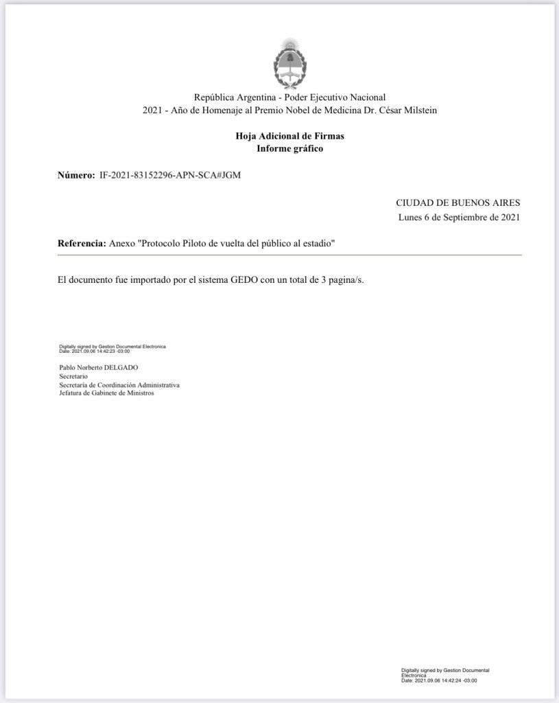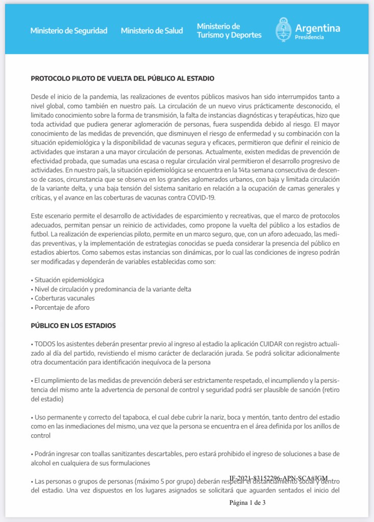 En la medida firmada de manera excepcional por los ministros Santiago Andrés Cafiero y Matías Lammens, que habilita la tan esperada puesta a la venta de las entradas para el partido del jueves en el estadio Monumental, también se aprueba el “PROTOCOLO PILOTO DE VUELTA DEL PÚBLICO AL ESTADIO”, aprobado por la autoridad sanitaria nacional.