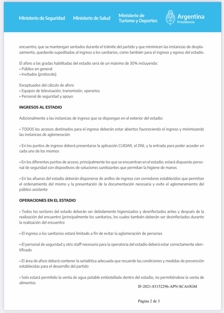 Tal como se había informado en el día de ayer, dicho Protocolo establece que el partido entre Argentina y Bolivia deberá realizarse con aforo del TREINTA POR CIENTO (30 %) respecto de la capacidad máxima autorizada para el estadio de River Plate, alrededor de 21 mil personas.