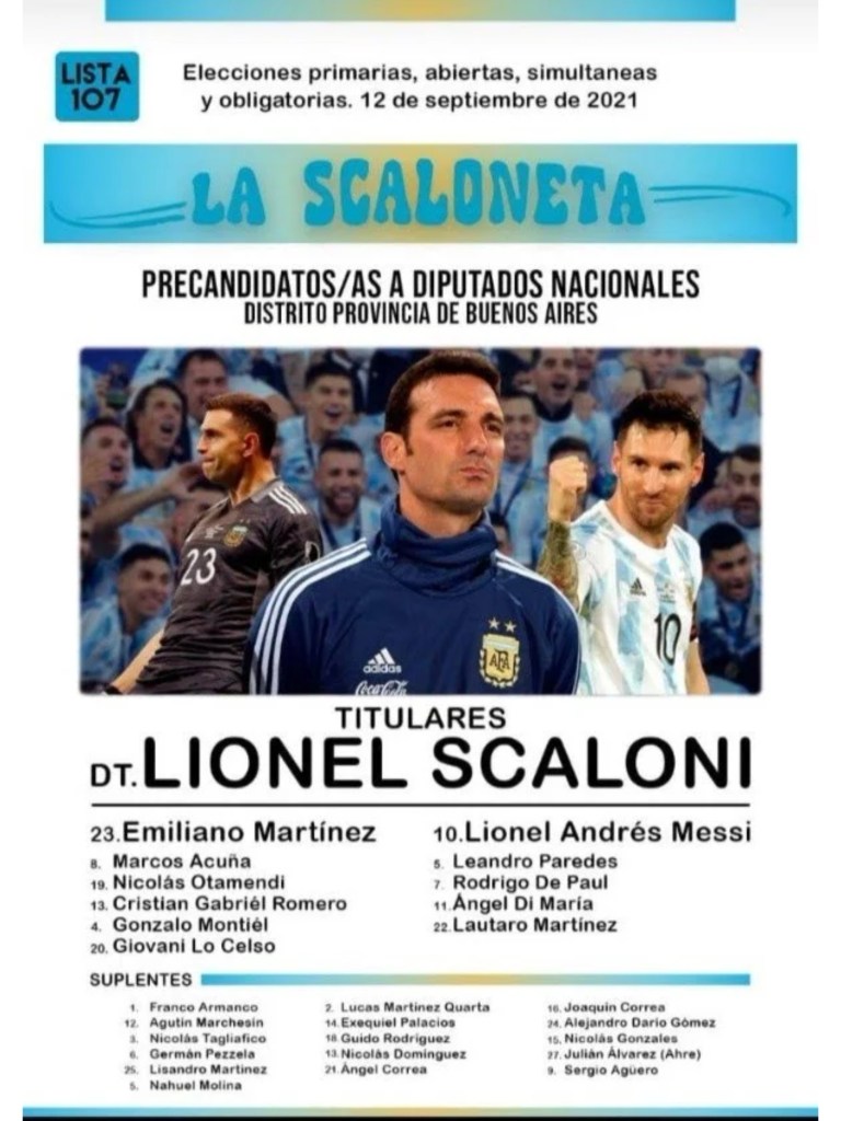 Entre los fieles de la Scaloneta (el equipo dirigido por Lionel Scaloni) decidieron armar una lista ficticia para las PASO Legislativas del 2021 con el rostro del entrenador como primer candidato. ¿Quién le sigue? El 10 del combinado nacional, con el número que lleva en su espalda. Dibu Martínez se llevó el tercer puesto de proriodad en el Partido.