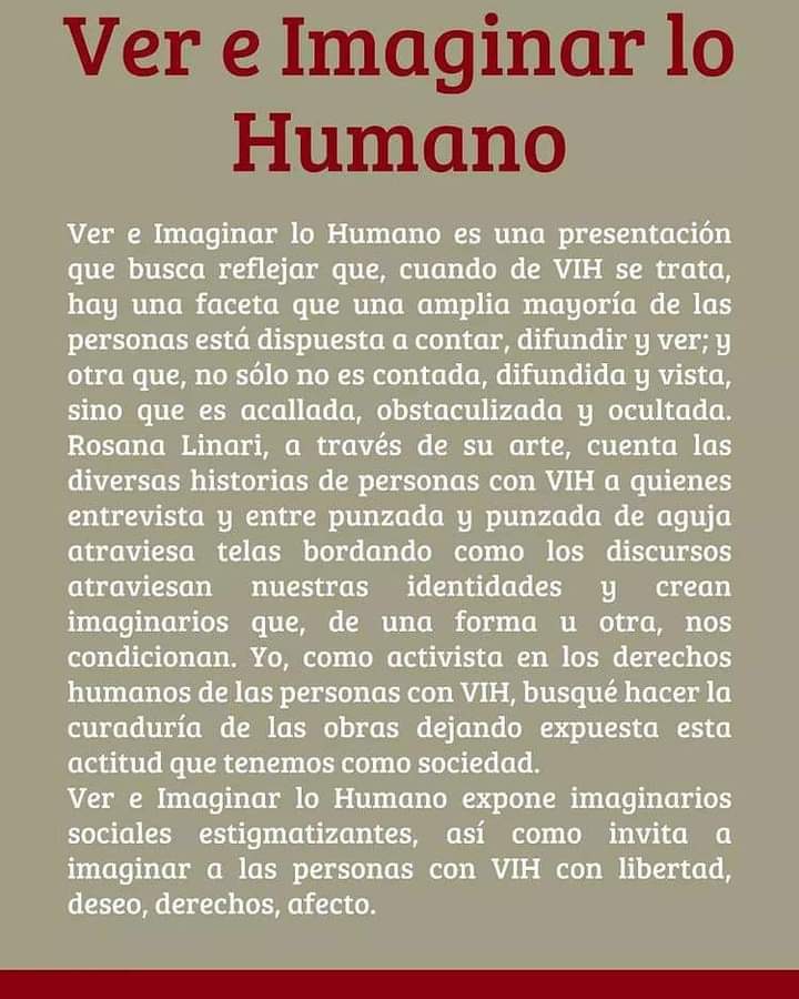 Por último, remarcó que “Ver e Imaginar lo Humano demandó una perspectiva del VIH que superara mi perspectiva personal, pues, entiendo que el VIH es un virus colectivo en tanto que lo tengo, otres cargan al virus y a mí con un estigma que no es nuestro, sino de quienes pretenden depositarlo en nosotres, y porque a la discriminación la erradicaremos entre todes unides.