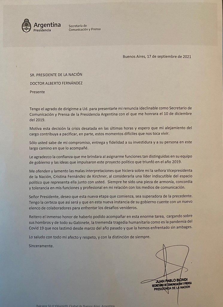 “Me ofenden y lamento las malas interpretaciones que hiciera sobre mí la señora vicepresidenta de la Nación, Cristina Fernández de Kirchner, al considerarla una líder indiscutible del espacio político que representa ella junto a usted” dice Biondi en un segmento de la nota, donde explica parte de los motivos que lo llevaron a tomar la decisión de abandonar el cargo.