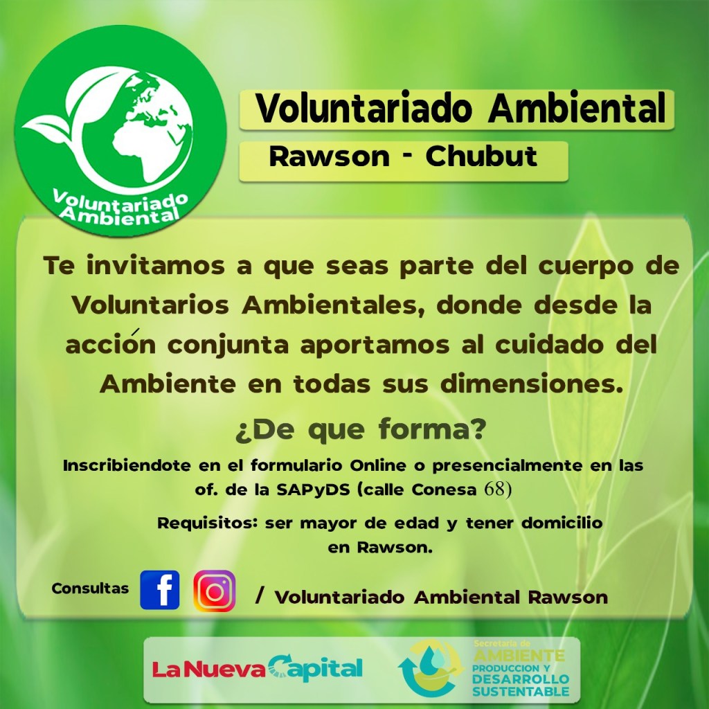 Los interesados en formar parte del Voluntariado Ambiental podrán anotarse ingresando al formulario online https://forms.gle/dBkYgg3GRrjUkQV27. Los requisitos son ser mayor de edad y tener acreditación de domicilio en la ciudad de Rawson.