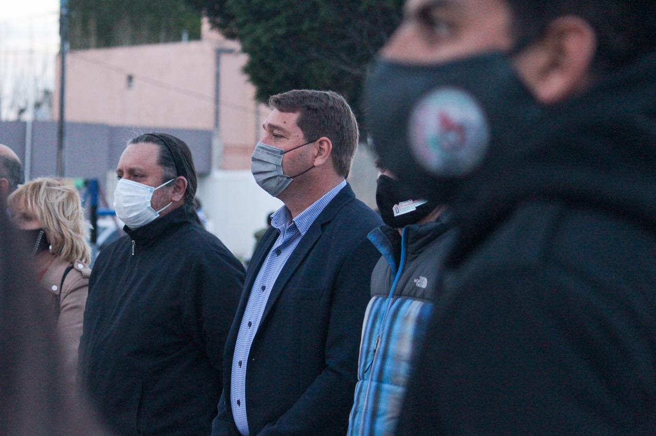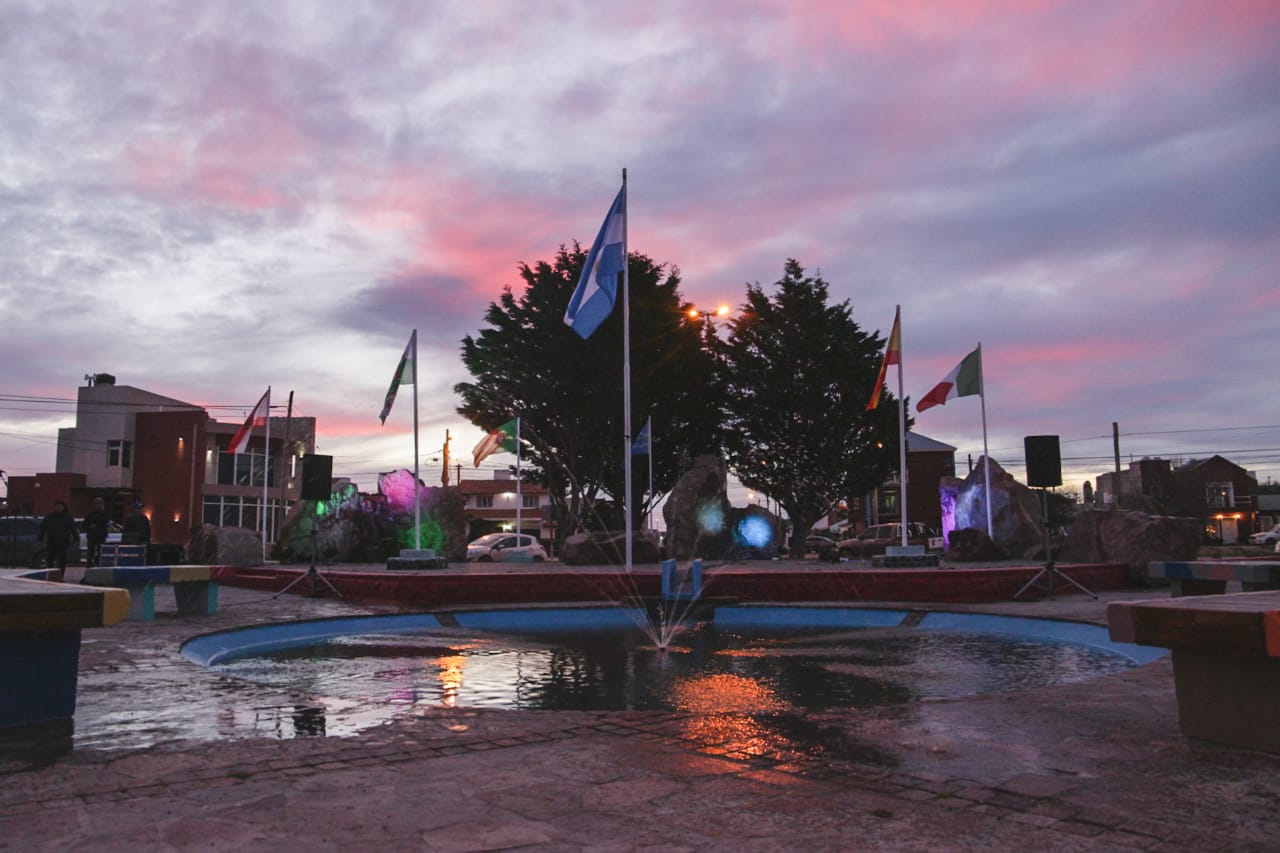 El intendente de Rawson, Damián Biss, junto al gabinete municipal, participaron de la reinauguración y puesta en valor de la Plaza de los Inmigrantes en la villa balnearia, este jueves a las 19 horas.