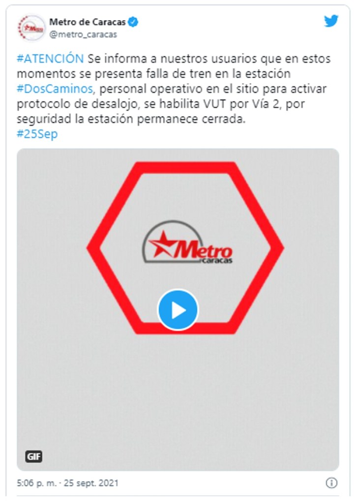 Asimismo, a través de su cuenta oficial, el subterráneo caraqueño informó sobre una “falla de tren en la estación Dos Caminos”, toda vez que aseguró que personal operativo en el sitio activó el protocolo de desalojo y que la estación permanece cerrada “por seguridad”.