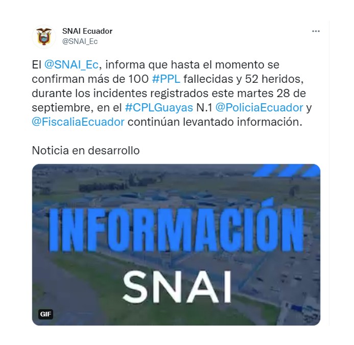 “El SNAI informa que hasta el momento se confirman más de 100 PPL (personas privadas de libertad) fallecidas y 52 heridos, durante los incidentes registrados este martes 28 de septiembre, en el CPLGuayas N1. La Policía de Ecuador y la Fiscalía continúan levantado información”, escribió en su cuenta de la red Twitter el SNAI.