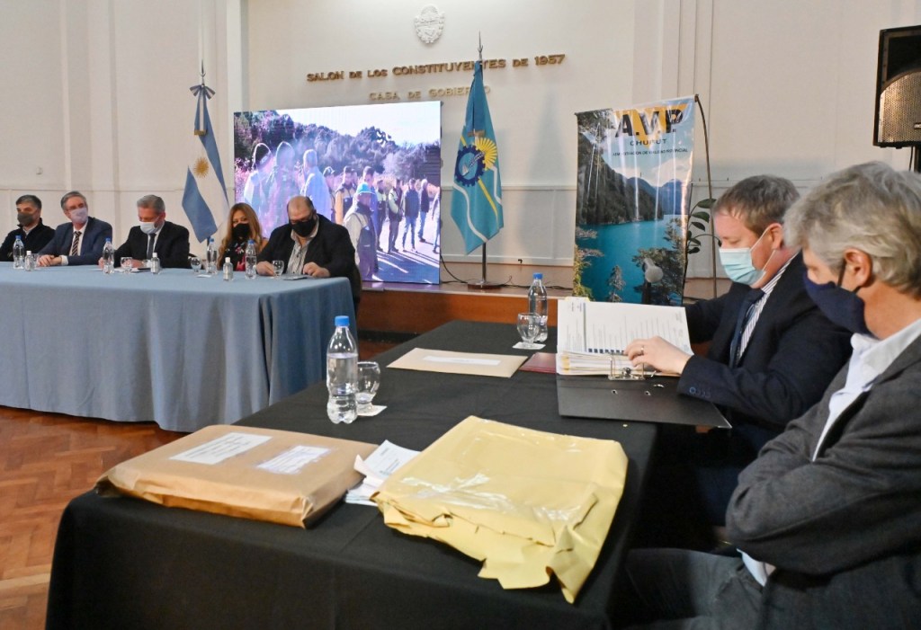 El gobernador del Chubut, Mariano Arcioni, encabezó este miércoles el acto de licitación pública N° 50/A.V.P/2021 para la pavimentación de la ruta provincial N° 71, en el tramo Portada Norte en el Parque Nacional Los Alerces y Villa Futalaufquen, con un presupuesto oficial de $170.025.629,66. Además, el mandatario provincial rubricó un convenio para ejecutar la obra de 100 instalaciones de gas domiciliarias a familias de Esquel por un monto de $20.915.184,06.