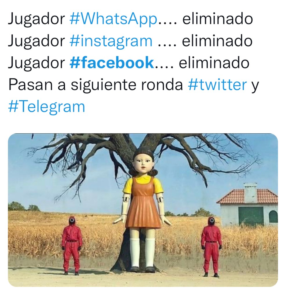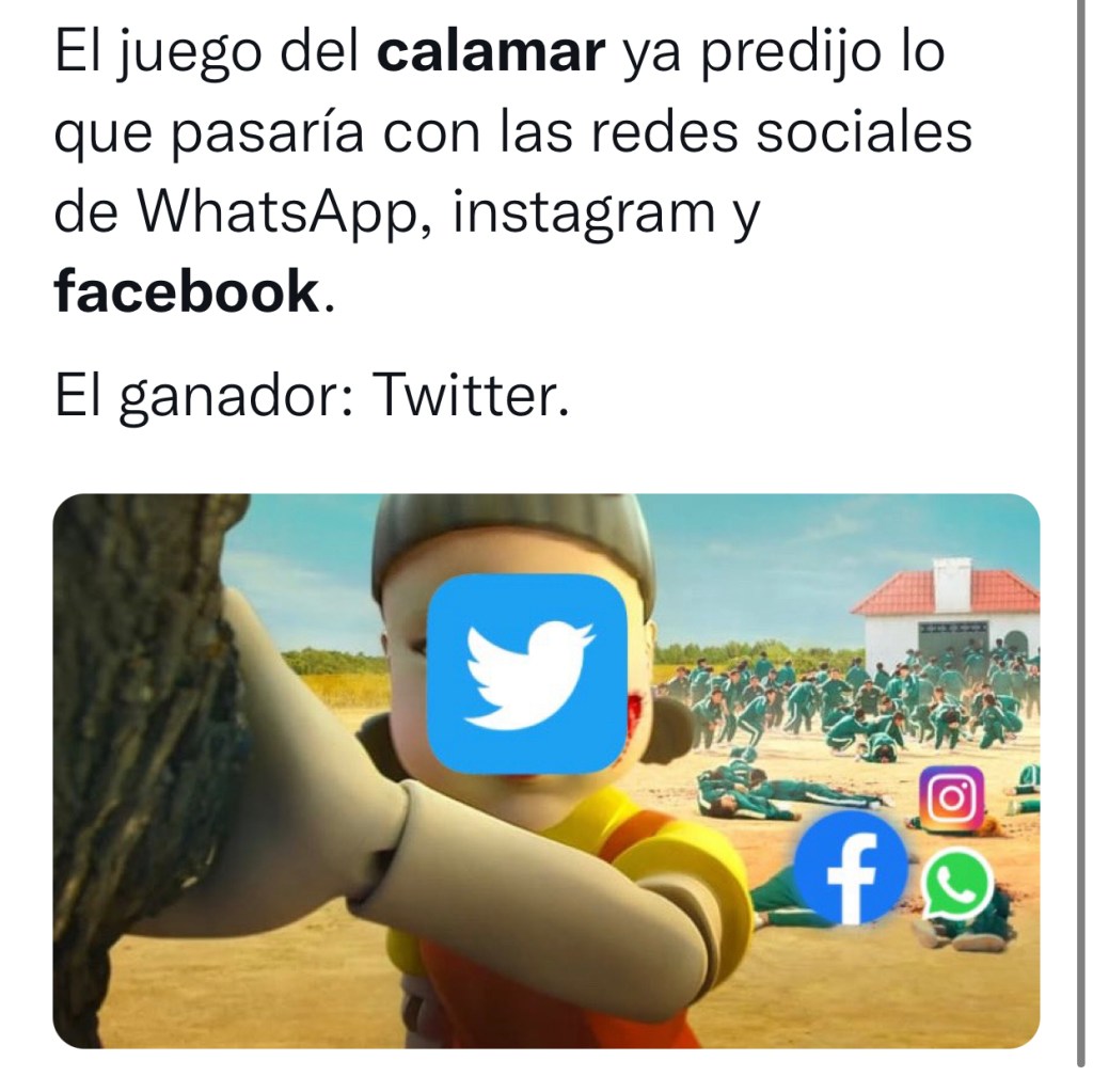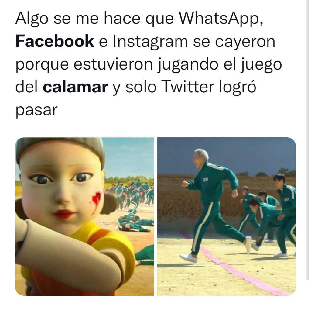 Ante la caída de los servicios de Facebook, Whatsapp e Instagram miles de usuarios en todo el mundo han empezado a compartir memes y burlas en referencia al apagón de las redes sociales de Mark Zuckerberg y uno de los predilectos ha sido utilizar imágenes de «El Juego del Calamar», la serie mas vista de Netflix de la historia.