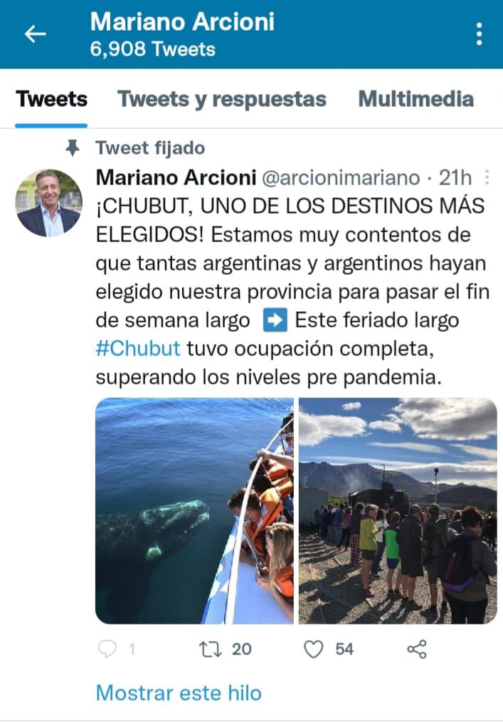 El gobernador Mariano Arcioni celebró en su cuenta de la red social Twitter que tantos turistas hayan elegido los destinos en las localidades de Chubut.