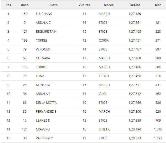 El piloto comodorense Christian Abdala comenzó temprano dominando el Turismo Nacional con el Toyota Etios del equipo GR Competición. Pero luego fue superado por el piloto de Chascomús, Juan Martín Eluchans, cerró el Grupo B siendo el piloto más veloz con una vuelta de 1m27s180.