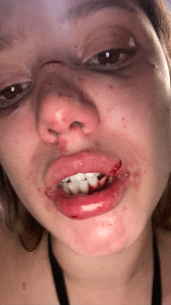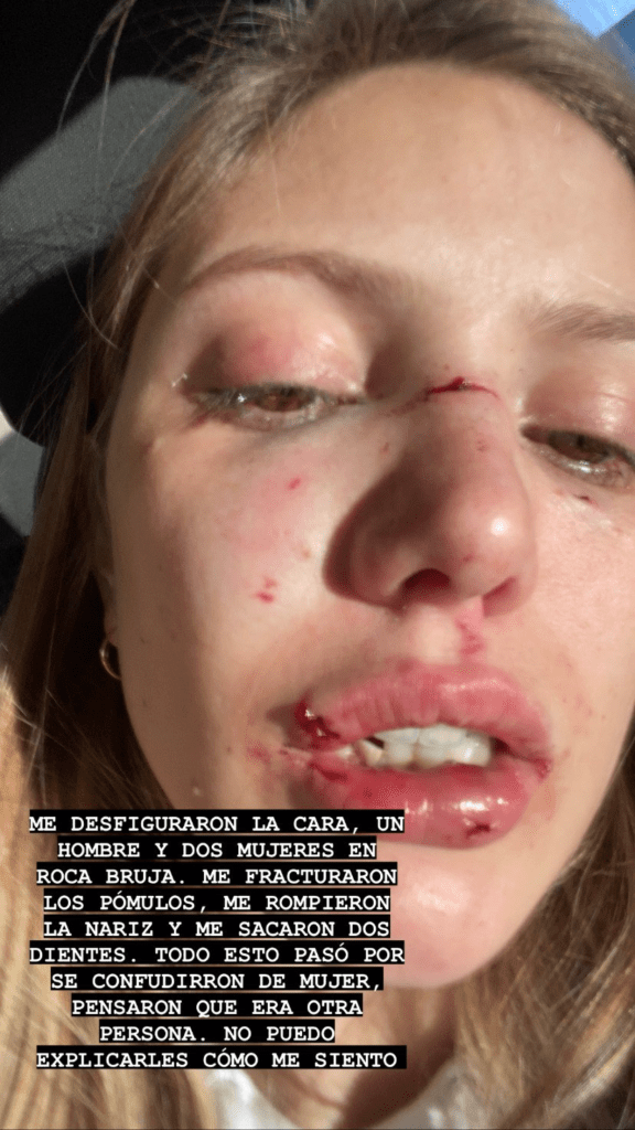 Entre los primeros datos que la joven brindó, detalló: «Me sacaron dos dientes, me fracturaron la mandíbula y tengo golpes en todo el cuerpo. A pesar de todo agradezco a Dios y a mi fuerza de poder haberme levantado y salir de ahí, sino no hubiera estado publicando esto. Hubo una chica que vio todo, que me agarró de la mano y que me dijo que ella estaba conmigo y que vio todo. Tenía pelo negro con rulos, por favor si ves esto habláme».