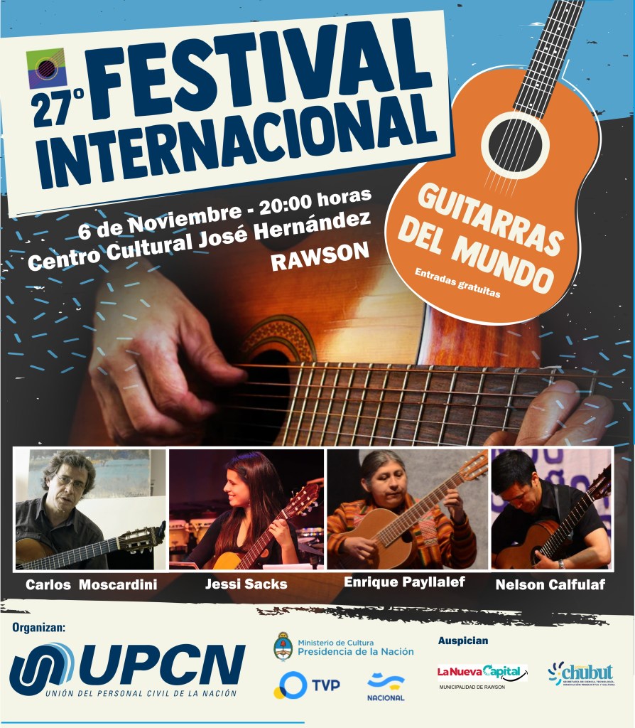 El Festival Internacional Guitarras del Mundo, organizado por UPCN junto al Ministerio de Cultura de la Nación, vuelve a los escenarios argentinos. 35 sedes en todo el país, 85 guitarristas de argentina y de distintos puntos del planeta se dan cita en esta nueva edición que suma 27 años ininterrumpidos. En Chubut la cita es para el sábado 6 de noviembre en el Centro Cultural José Hernández de Rawson, desde las 20:00 horas con entrada gratuita.