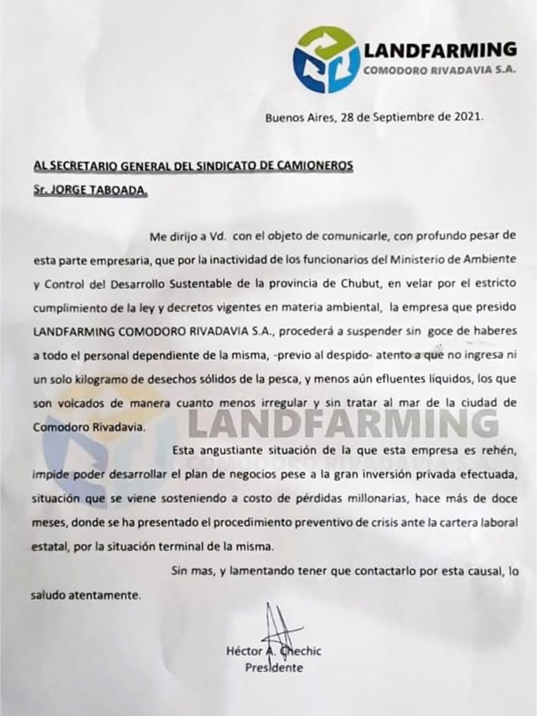 Asimismo, aclaró que “ya fuimos notificados de que 30 compañeros de Puerto Madryn, Comodoro Rivadavia y Puerto Deseado serán suspendidos sin goce de haberes para luego ser despedidos”.