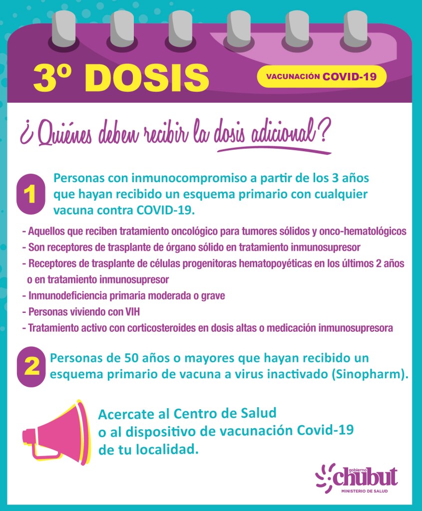 El Ministerio de Salud de la provincia, que conduce Fabián Puratich, a través de la Dirección Provincial de Patologías Prevalentes y Epidemiología, explicó en qué consiste la dosis adicional de la vacuna contra COVID-19, que comenzó a aplicarse recientemente en el marco de la Campaña “Chubut Vacunate”, y precisó quiénes deben recibirla, y cuándo y dónde pueden aplicársela.