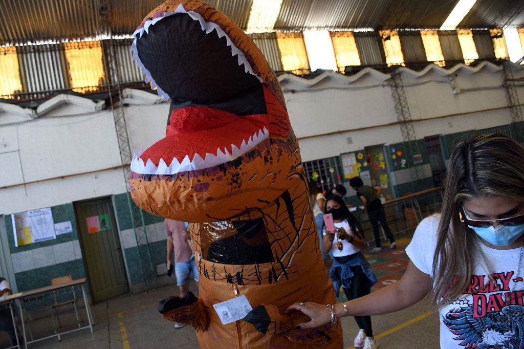 Un hombre que concurrió a votar con el disfraz de dinosaurio en la Escuela Santa Isabel de Hungría, ubicada en Cafferatta al 4000, en la zona sur de Rosario.