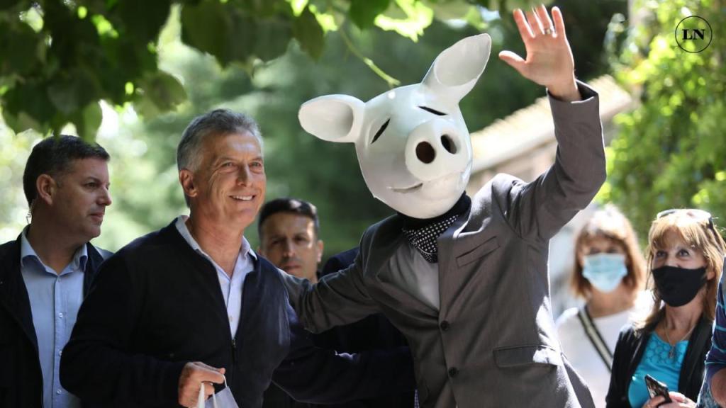 Un hombre vestido con traje color gris y una cabeza de chancho blanca que escondía la suya se mostró en las escalinatas de la Facultad de Derecho de la Universidad de Buenos Aires (UBA) cuando llegó a votar el jefe de Gobierno porteño, Horacio Rodríguez Larreta.