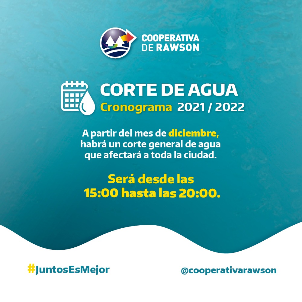 La Cooperativa de Rawson informó que a partir del mes próximo comenzará a aplicar un corte general de agua que afectará a toda la ciudad de cinco horas diarias, desde las 15 hasta las 20.