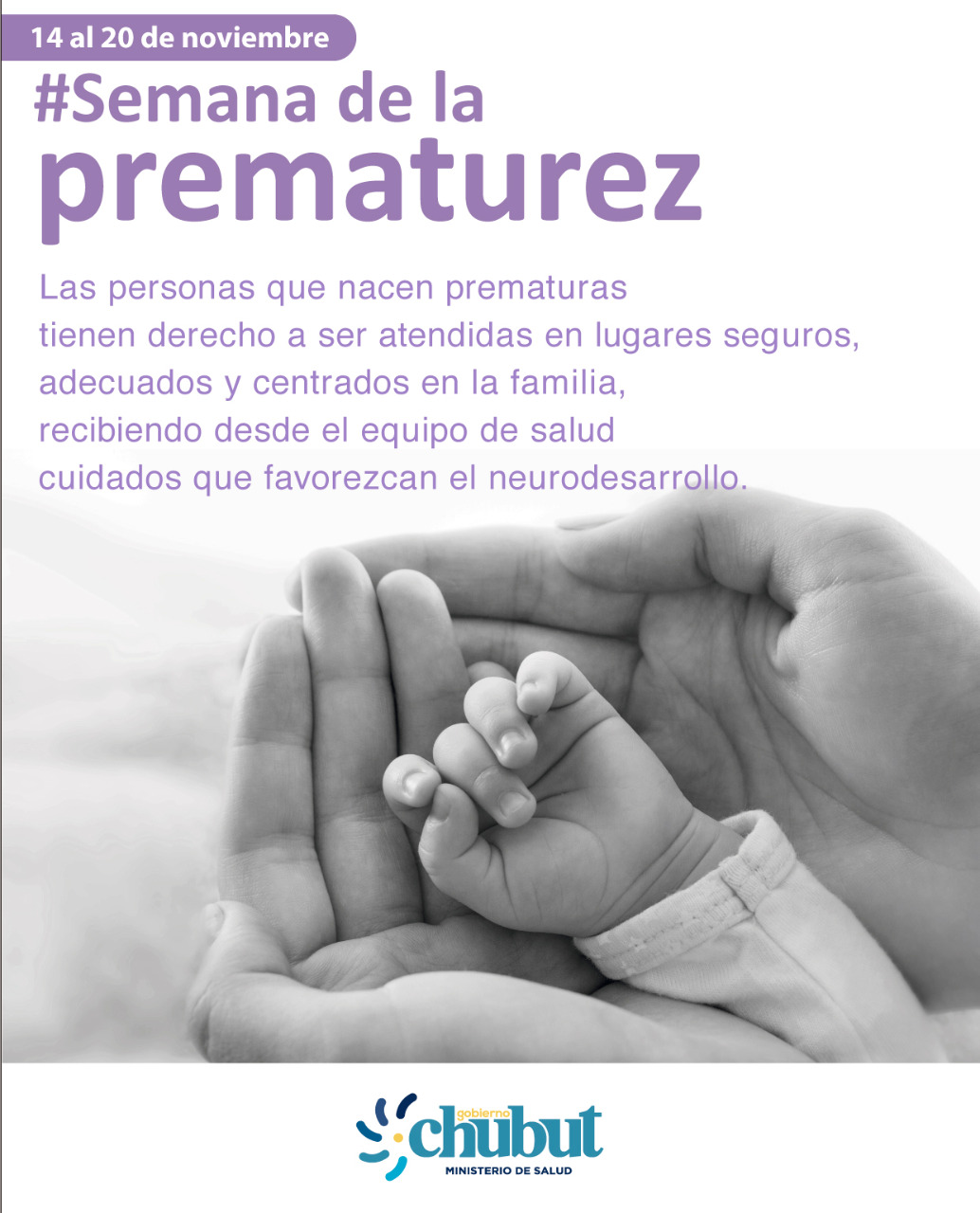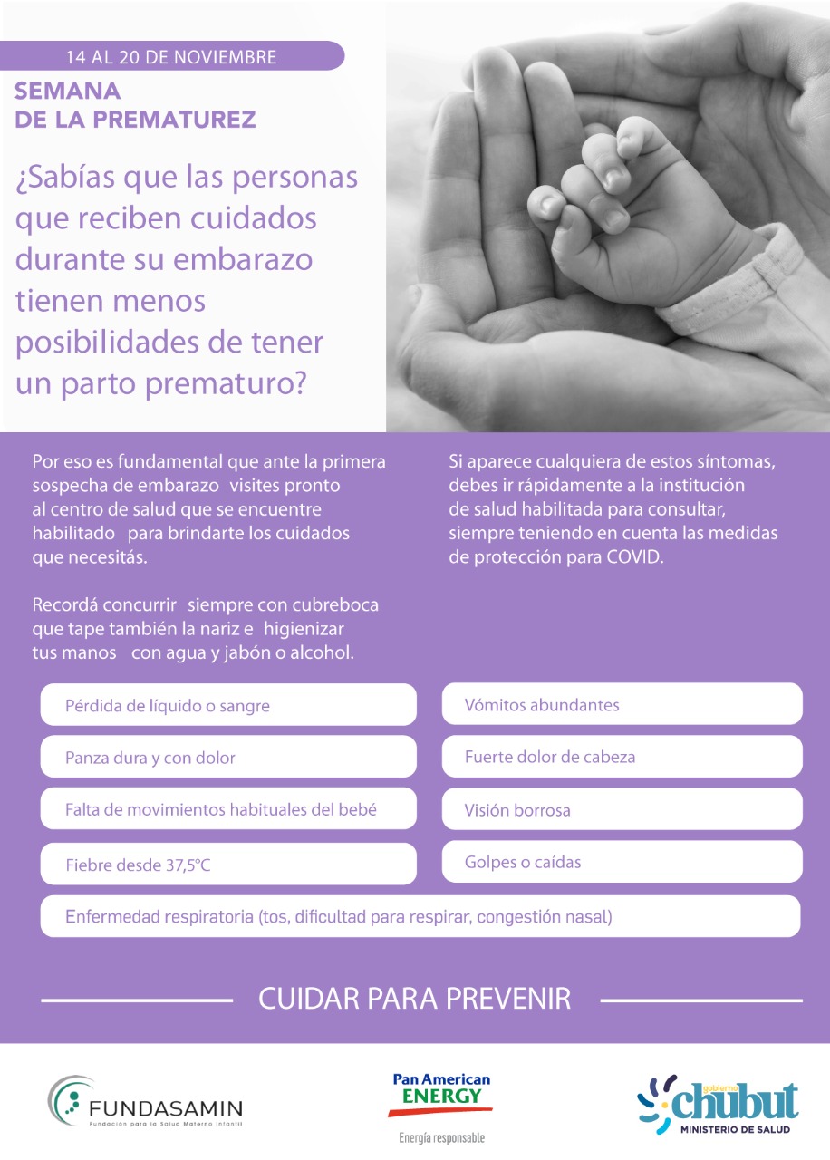El Ministerio de Salud, que conduce Fabián Puratich, recordó a la población chubutense la importancia que tienen los controles de salud prenatales en el caso de las mujeres y personas con capacidad de gestar, para poder asegurar así cuidados de calidad a los niños y las niñas por nacer en la provincia, en ocasión de conmemorarse la “Semana Mundial de la Prematurez”, que se celebra del 15 al 19 de noviembre, bajo el lema