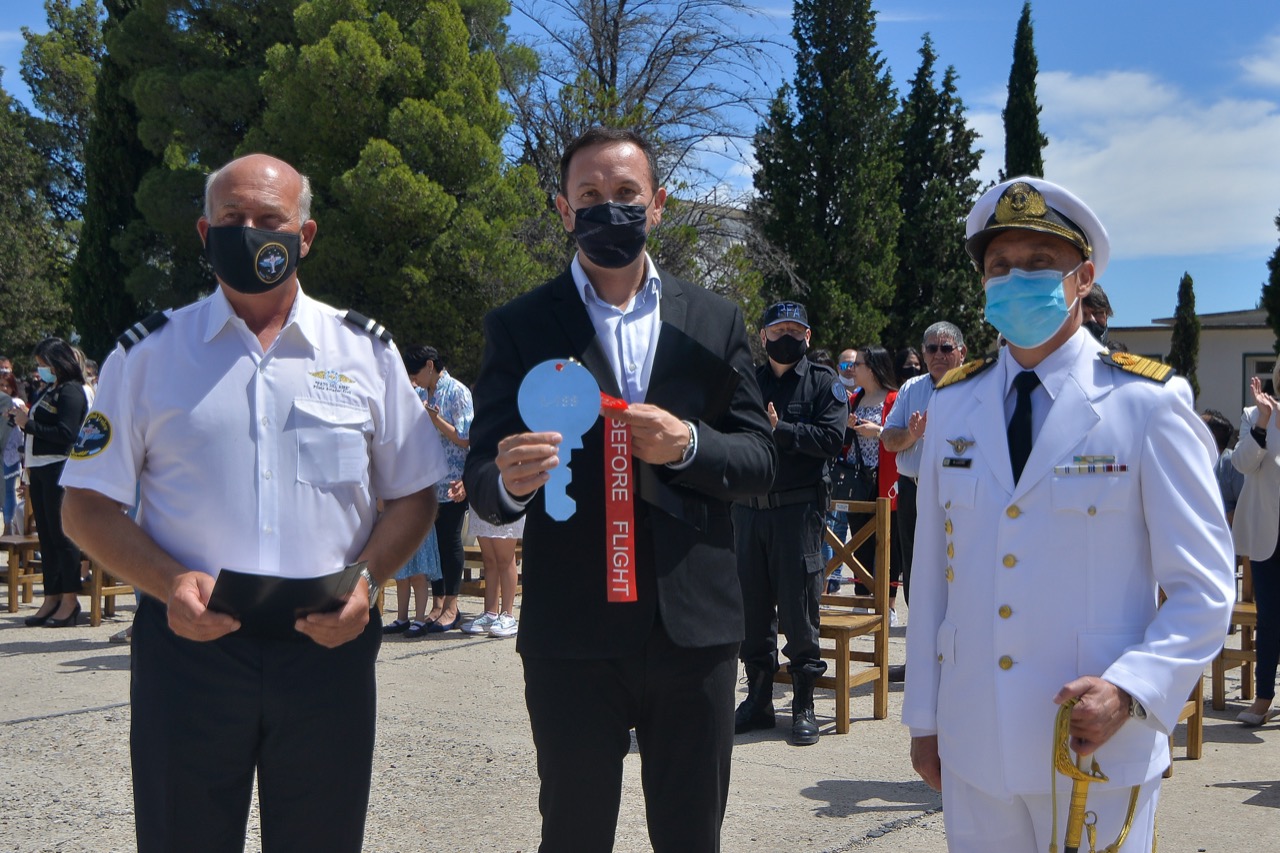 El intendente recibió de forma simbólica de manos del Jefe de la Base Aeronaval N°3, Martín Rodolfo Lucero, la llave del avión que será destinado a ser utilizado como equipamiento de enseñanza.