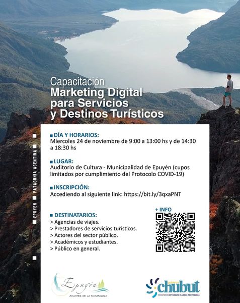 El Ministerio de Turismo y Áreas Protegidas del Chubut invita a agencias de viajes, prestadores turísticos, actores del sector público y a la comunidad general, a participar de la capacitación presencial sobre «Marketing digital para Servicios y Destinos Turísticos», que se realizará los días 24 y 25 de noviembre próximo, en las localidades de Epuyén y Esquel, respectivamente.
