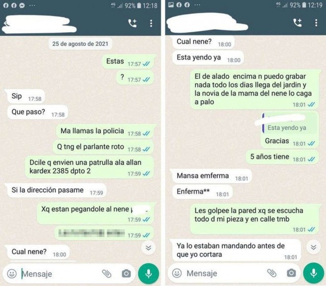 El chat de WhatsApp es sostenido entre una vecina con una amiga, cuando le pedía que llame a la Policía porque estaban golpeando al pequeño Lucio.