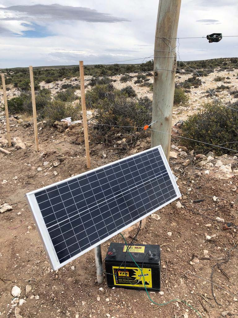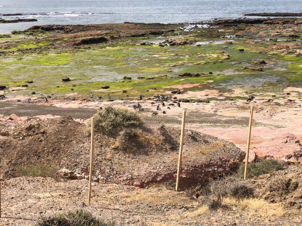 3- Sobre el trayecto de la franja afectada se constató la instalación un nuevo alambrado de 6 hilos, que además anexa un boyero electrificado, conectado a una batería con alimentación solar, el cual impide el libre tránsito de fauna nativa. La traza de camino alambrado se extiende, estimativamente, 700 metros tierra adentro en forma perpendicular hasta la costa, en donde continúa en forma paralela al mar por unos 60 metros aproximadamente. El boyero electrificado se extiende a lo largo de todo el alambrado y en diferentes sectores está a la altura de los pingüinos. En algunos sectores, la presencia de pequeños cañadones deja el alambrado a una altura que impediría el paso de estas aves, pero se observa que se ató la parte baja del alambrado a rocas, lo cual impide el tránsito de los pingüinos. Se pudo observar el desconcierto de los adultos que regresaban del mar pretendiendo retornar a sus nidos al ver a sus crías obstaculizadas para poder ingresar.