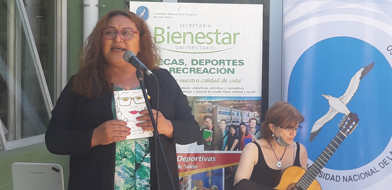 En el acto organizado por el equipo de Bienestar Universitario de la sede Trelew de la Universidad Nacional de la Patagonia SJB Nadia Zuñiga, Directora de Diversidad y Género de la Municipalidad de Trelew compartió poemas de su libro “Tiempo de Mariposa”.