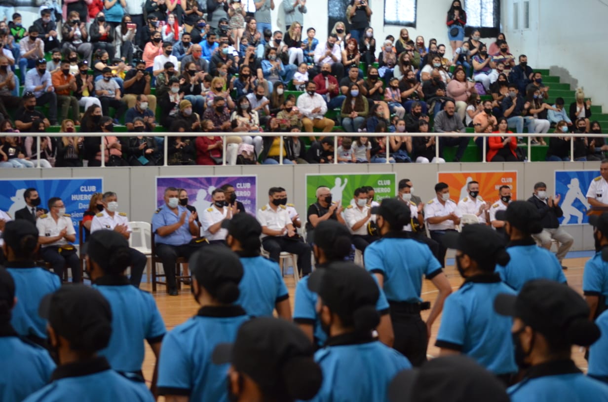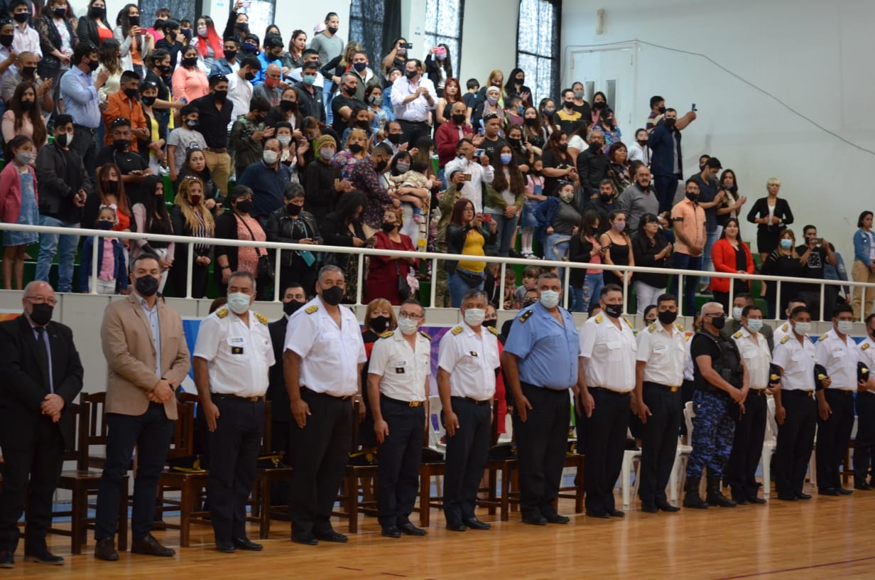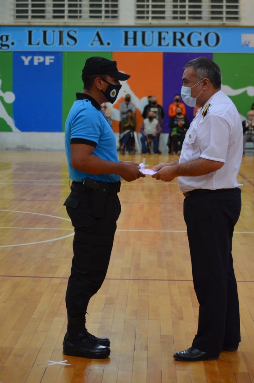 El acto oficial tuvo lugar esta mañana en el Club Huergo de Kilómetro 3. Estuvieron presentes además integrantes de la Plana Mayor de la Policía, el director del Centro de Formación, Martín Guajardo; autoridades judiciales y de distintas fuerzas de seguridad, funcionarios municipales, entre otros.