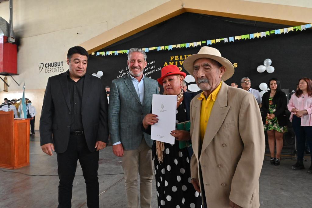 Arcioni presidió el acto por el 85 aniversario de Paso de Indios, entregó viviendas y firmó convenios para la ejecución de más unidades habitacionales