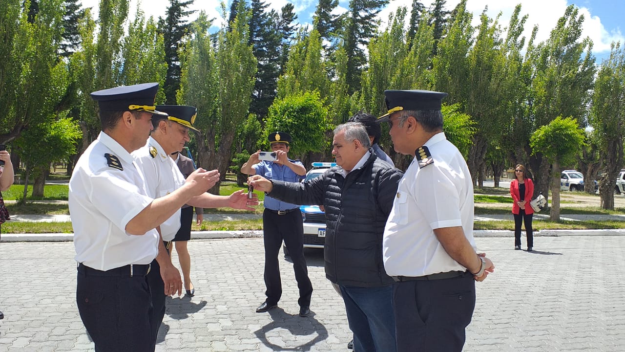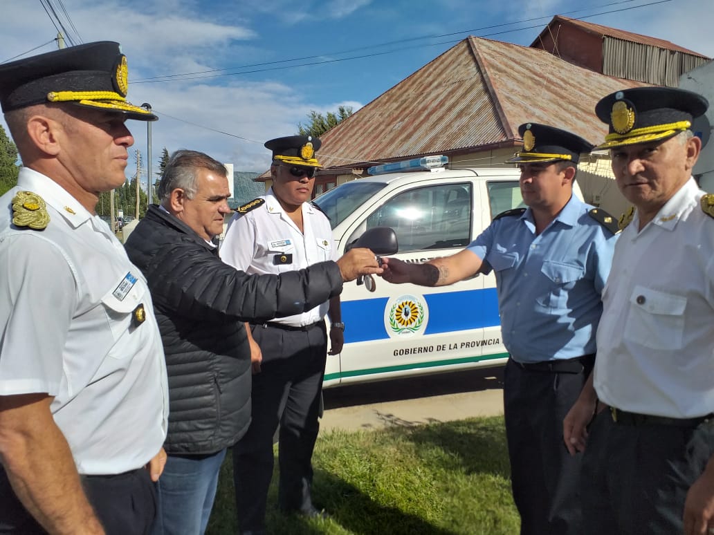 El titular de la cartera de seguridad y el jefe de la Policía del Chubut, Comisario General Víctor Acosta, encabezaron la entrega de un vehículo y dos camionetas para las localidades de José de San Martín, Río Pico y Gobernador Costa.