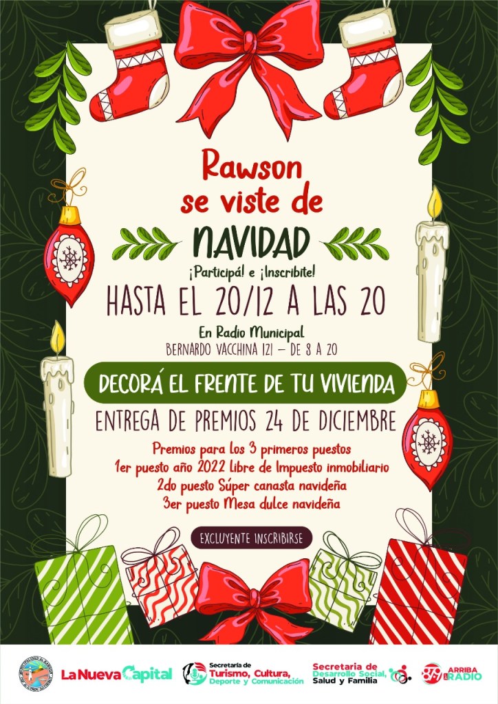 La Municipalidad de Rawson, a través de las Secretarías de Turismo, Cultura, Deporte y Comunicación; Desarrollo Social y Familia; y Radio Municipal Rawson, lanzó el concurso “Rawson se viste de Navidad” que busca que los vecinos decoren con espíritu navideño el frente de sus viviendas.