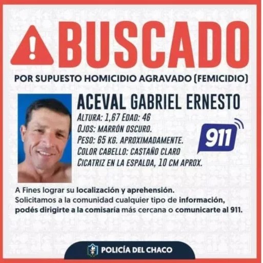 Gabriel Ernesto Aceval (45) escapó después de cometer el femicidio y hoy es el hombre más buscado de la provincia. Más de 100 policías de distintas divisiones están tratando de dar con su paradero. Lo buscan por descampados, rutas, caminos rurales y montes, pero todavía no han conseguido obtener una pista certera.