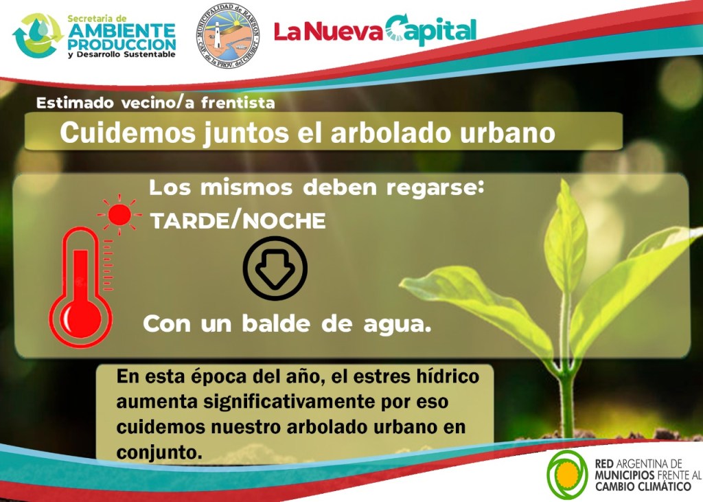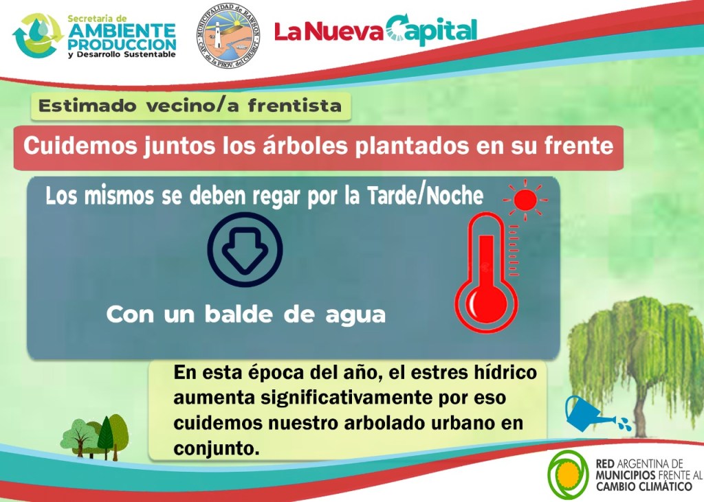 Ciccarone invitó a la comunidad de Rawson “a participar de esta campaña, que colaboren con el cuidado de nuestros árboles que tienen un rol muy importante, necesitamos concientizar a la población el colaborar con el cuidado del árbol, regarlo, que le suministren agua en un total de 25 litros de agua por semana, con un balde de agua por día es suficiente para tenerlos hidratados y que permite además que sigan creciendo correctamente ofreciendo su belleza a nuestra ciudad”, apuntó.