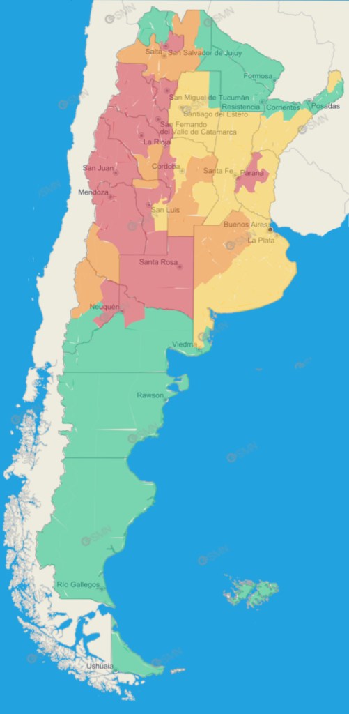 En este marco, y ya con casi una semana de temperaturas muy elevadas, el SMN emitió una advertencia de nivel rojo para las provincias de Tucumán, Catamarca, La Rioja, San Juan, Mendoza, La Pampa, San Luis; este de Neuquén, noroeste de Río Negro, oeste de Córdoba, sudeste de Jujuy y gran parte de Entre Ríos.