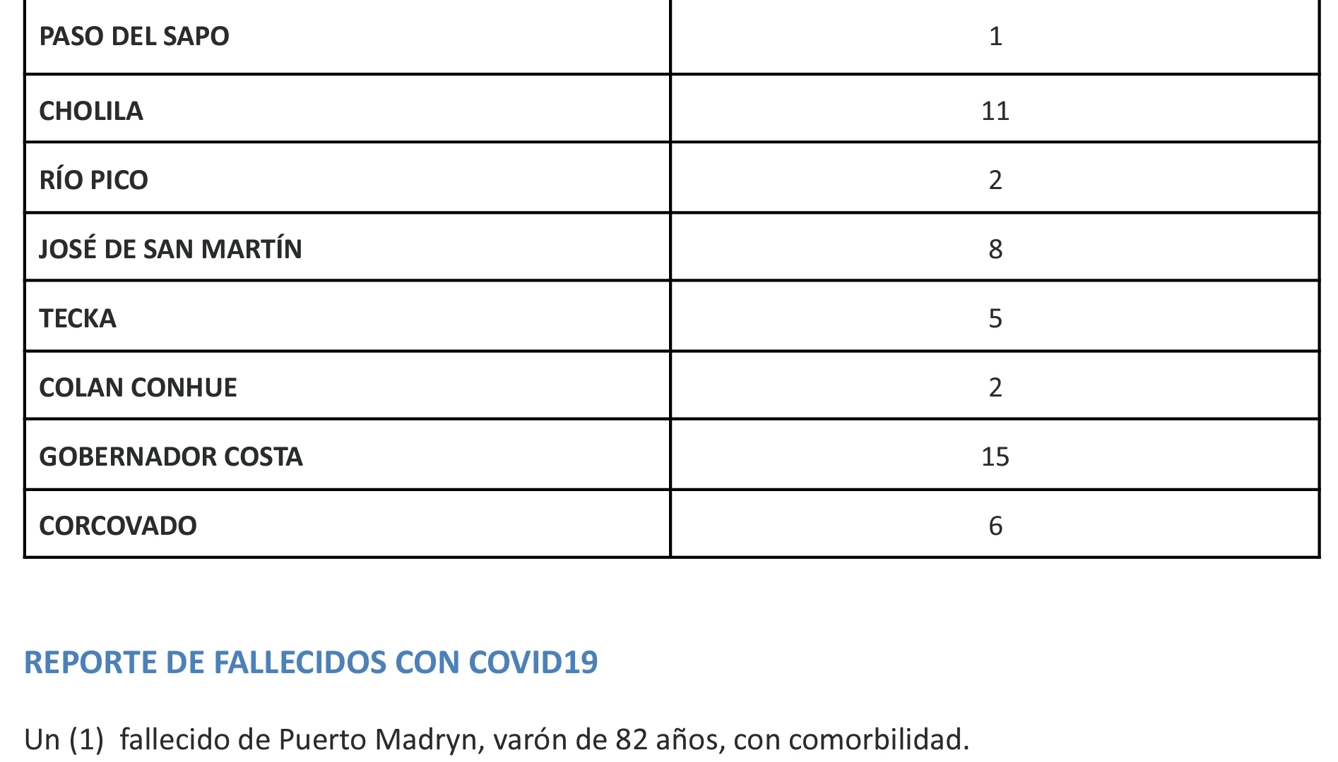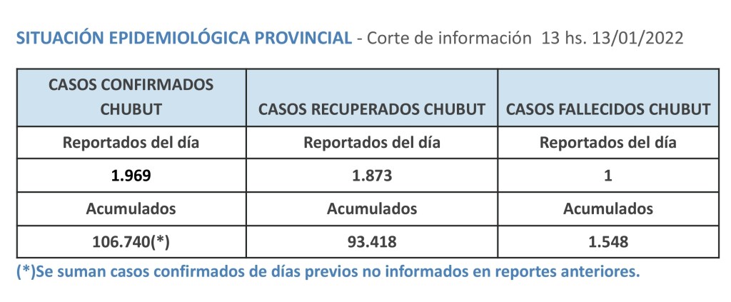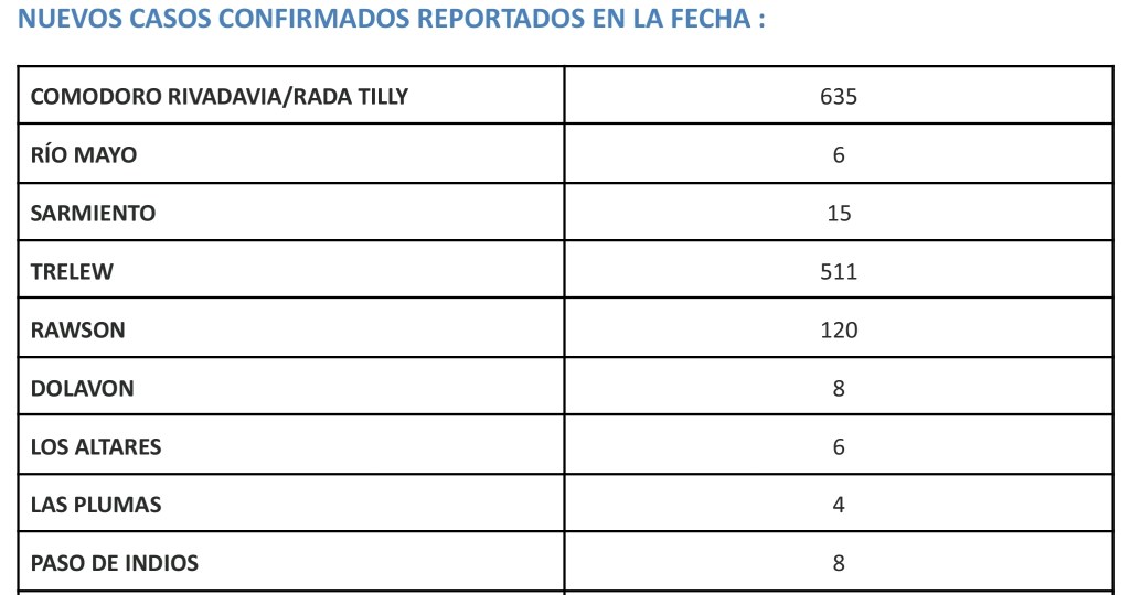 Además falleció un hombre de 82 años en Puerto Madryn. Las localidades con más contagios son Comodoro, Trelew, Madryn y Rawson. La Capital presenta una baja en los casos. En total la provincia tiene 1703 casos activos.