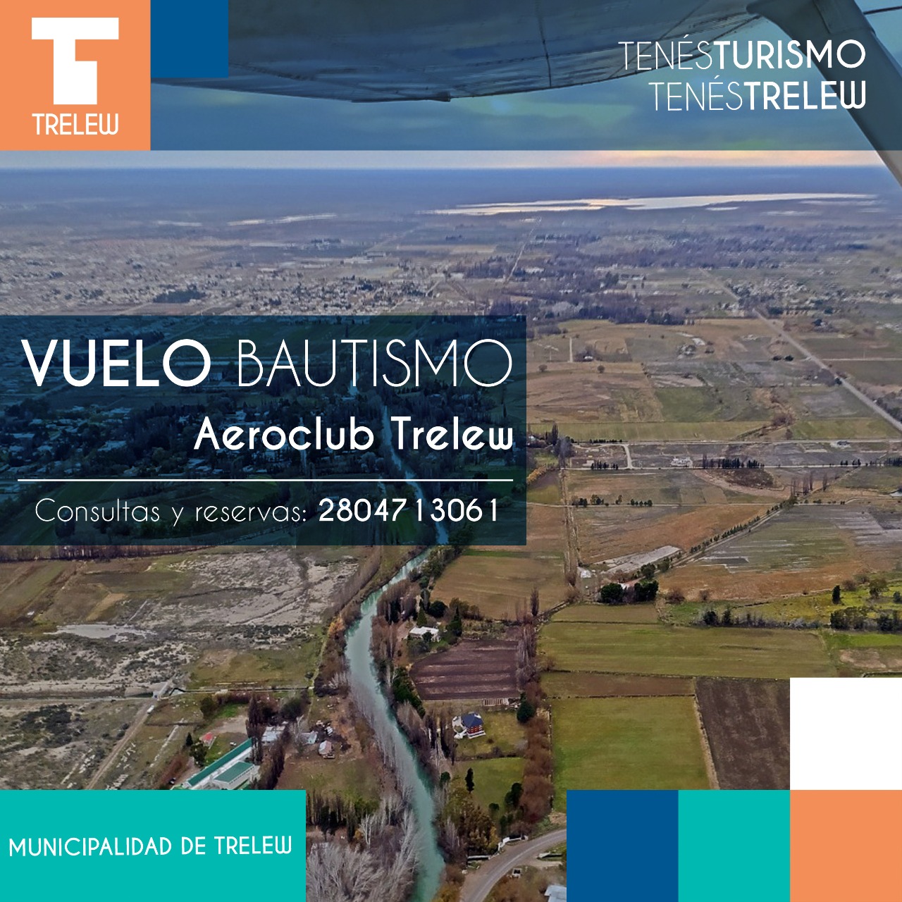 El Aeroclub de Trelew continúa ofreciendo los vuelos de bautismo para observar y disfrutar desde el aire una panorámica de la ciudad de Trelew, El Río Chubut, Centro