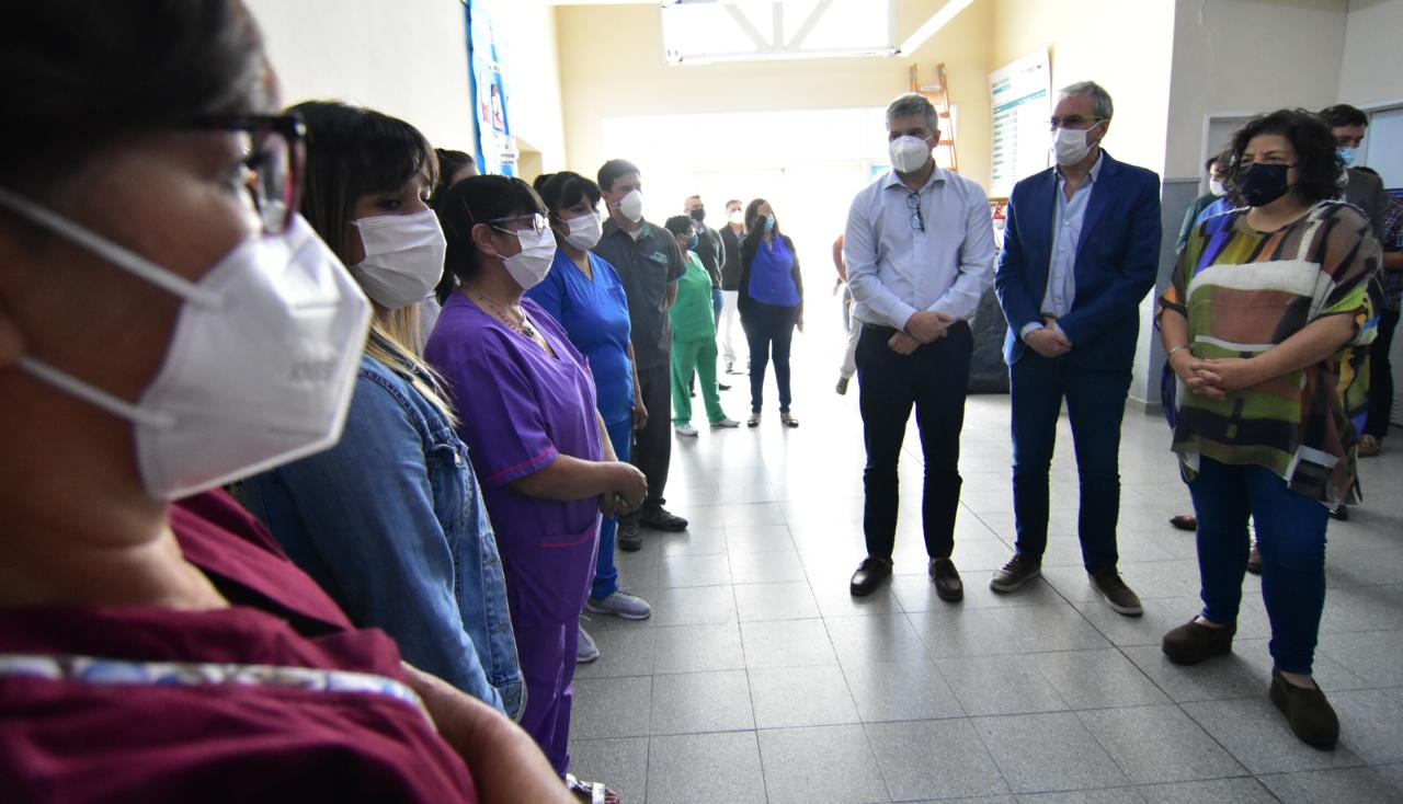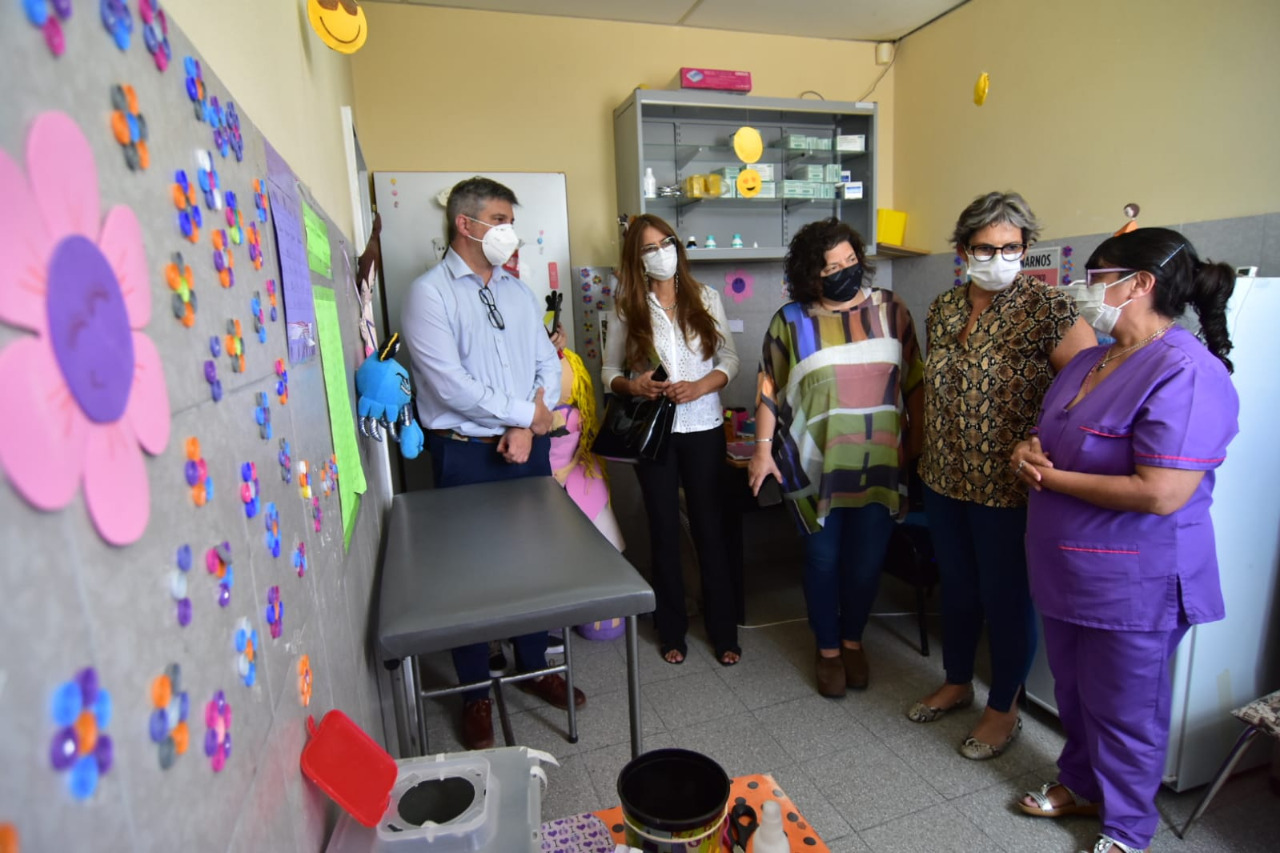 En primer término, la titular de la cartera sanitaria nacional visitó el vacunatorio que funciona en el Centro de Atención Primaria de la Salud del Barrio Etchepare de Trelew, donde fue recibida por los subsecretarios de Gestión Institucional, Mariano Cabrera y de Programas de Salud, Laura Pizzi, el titular del Área Programática Trelew, Eduardo Ramírez, los directores del Hospital, Cristian Setevich, del Centro Materno Infantil de Trelew, Matías Mendelevich, médicos, enfermeras y personal sanitario.