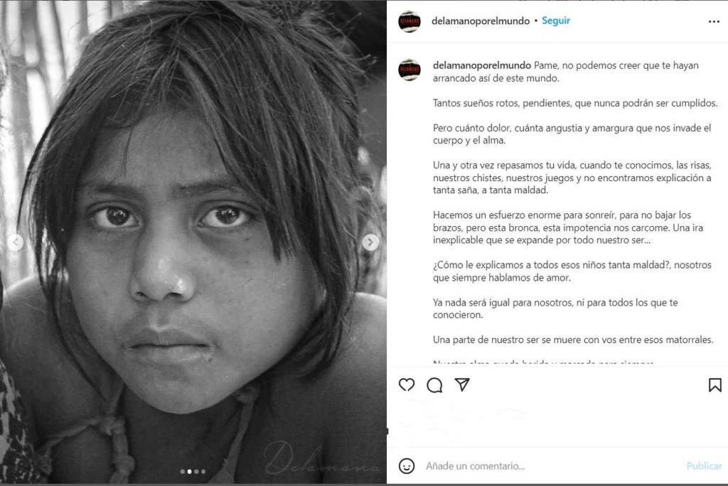 Los miembros de la ONG la despidieron en su cuenta de Instagram: “La última vez que la vimos fue cuando repartimos ‘picole’ luego de unos juegos. Hoy verla tapada de arbustos fue estremecedor, un dolor inexplicable. Algo de nosotros se quedará ahí, detrás de esas piedras para siempre. Quien tomó su vida, también se lleva una parte de la nuestra. Ojalá pequeña, donde estés, puedas encontrar esa alegría con la que siempre nos recibiste”.