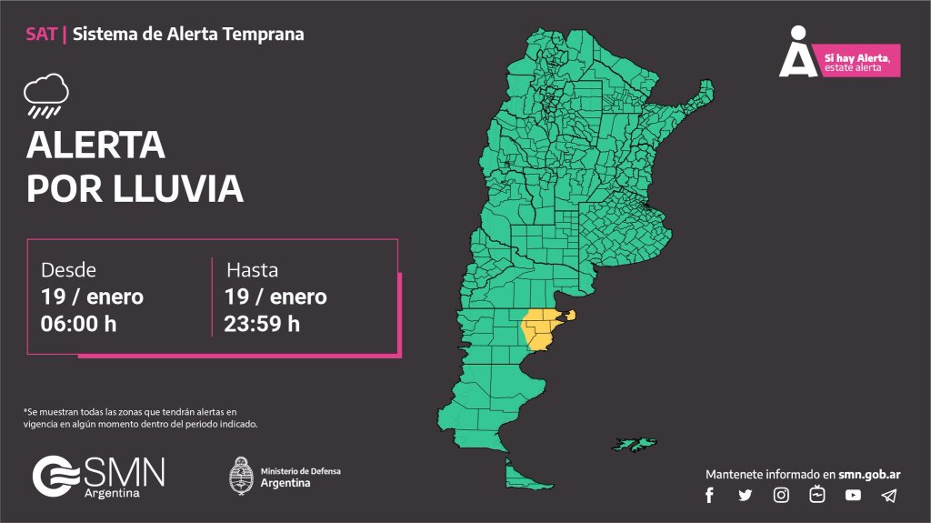 El Servicio Meteorológico Nacional ha emitido una alerta amarilla para la zona este de la provincia del Chubut por fuertes lluvias y tormentas eléctricas para el día de hoy y mañana.