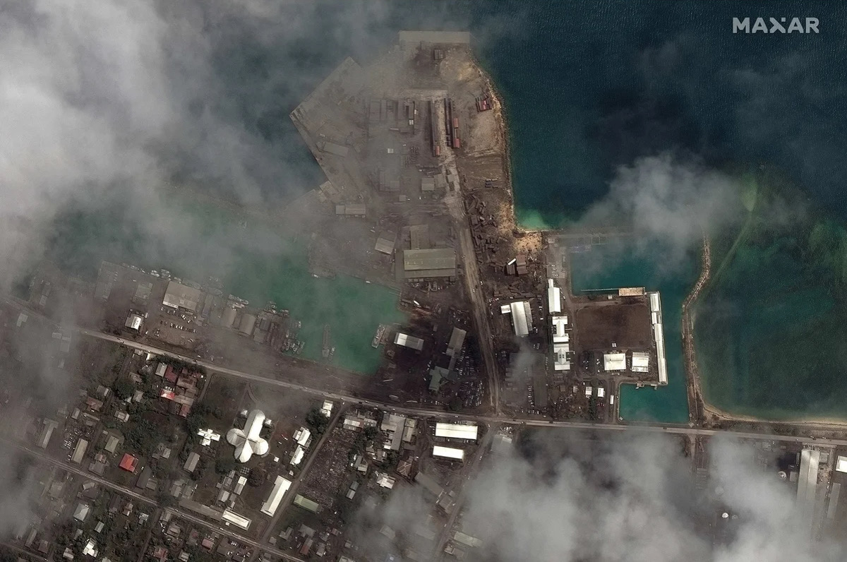 Imágenes divulgadas por el Centro de Satélites de la ONU mostraron el impacto de la erupción y el tsunami en la pequeña isla de Nomuka, una de las más cercanas al volcán Hunga-Tonga-Hunga-Ha’apai.