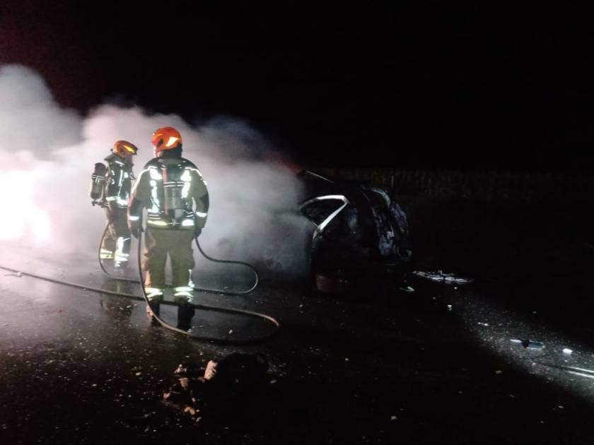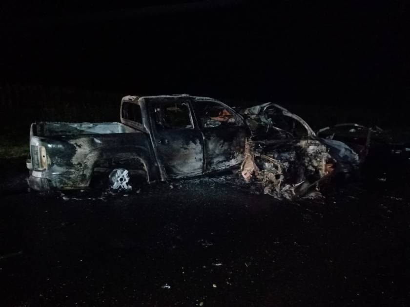 Alertados por los automovilistas que circulaban por la ruta, dos dotaciones de bomberos de Coronel Moldes se llegaron hasta el lugar para controlar el incendio y rescatar a las personas involucradas, en la principal tragedia vial de la zona.