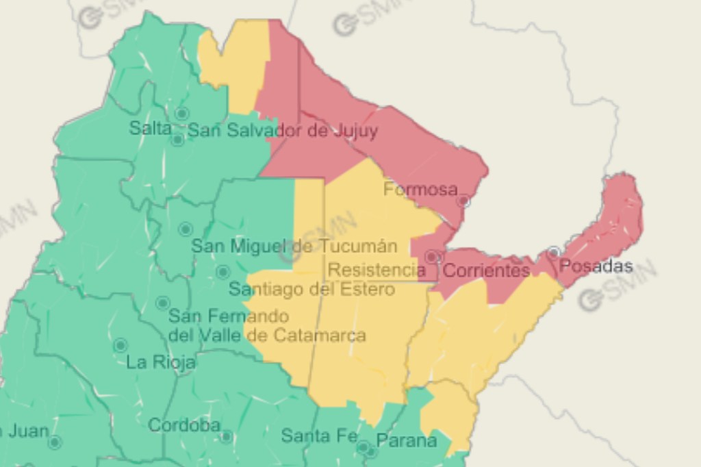 En alerta amarillo, en tanto, se encuentran el centro y sur de Corrientes; el norte de Santa Fe, localidades de centro y sur de Chaco; el norte de Entre Ríos, el este de Santiago del Estero y algunas localidades de Salta.