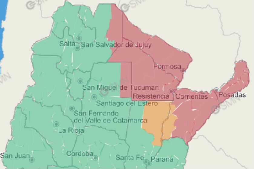 La alerta roja abarca la totalidad de las provincias de Chaco, Formosa y Misiones y gran parte de Corrientes, a lo que se suma las localidades de Rivadavia en Salta; y Alberdi, Copo y Moreno, en el este de Santiago del Estero.
