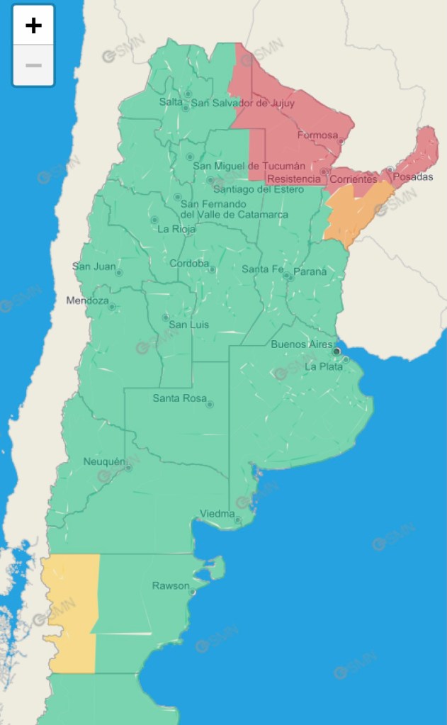 Además está bajo «alerta naranja», que implica la presencia de temperaturas que «pueden ser muy peligrosas, especialmente para los grupos de riesgo», gran parte de la provincia de Corrientes.