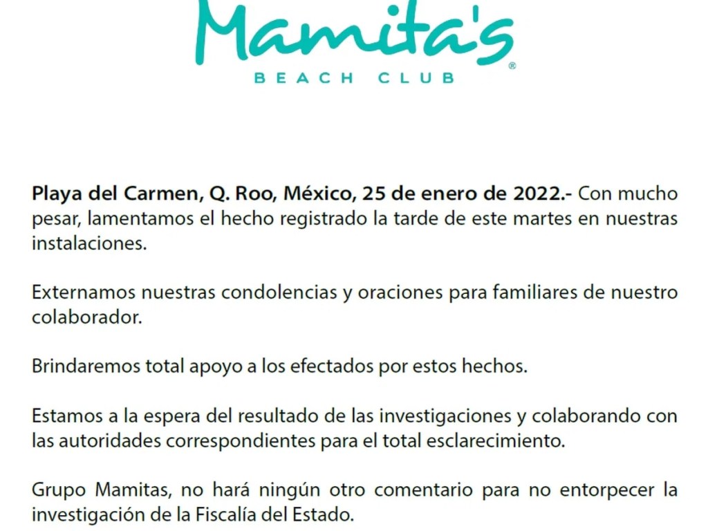 Por su parte, desde Mamita’s Beach Club emitieron ayer un comunicado publicado también en los medios de prensa mexicanos en los que se lamenta el suceso y se explica que no darán detalles de lo ocurrido para no entorpecer la investigación.