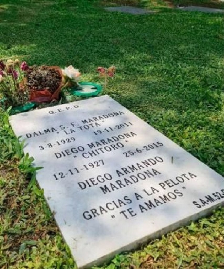 Cora Gamarnik, quien publicó en su cuenta de la red social Twitter una imagen de la tumba de Diego Maradona captada a pocos centímetros en la que pueden leerse los nombres y los apodos de su madre Dalma Maradona «La Tota», de su padre Diego Maradona «Chitoro», con sus respectivas fechas de nacimiento y fallecimiento, y más abajo está el nombre completo de Diego Armando Maradona (sin su apodo «Pelusa» ni sus fechas) y finalmente la frase que alguna vez había pedido que se coloque sobre su lápida: «GRACIAS A LA PELOTA». Luego aparece la consigna «Te Amamos», en nombre de sus hijas.